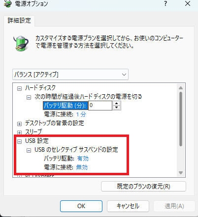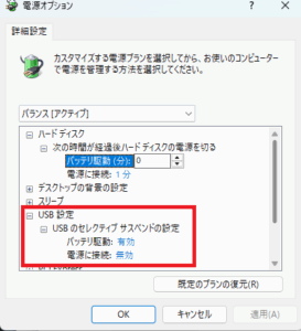 USBセレクティブサスペンド設定が有効になっている